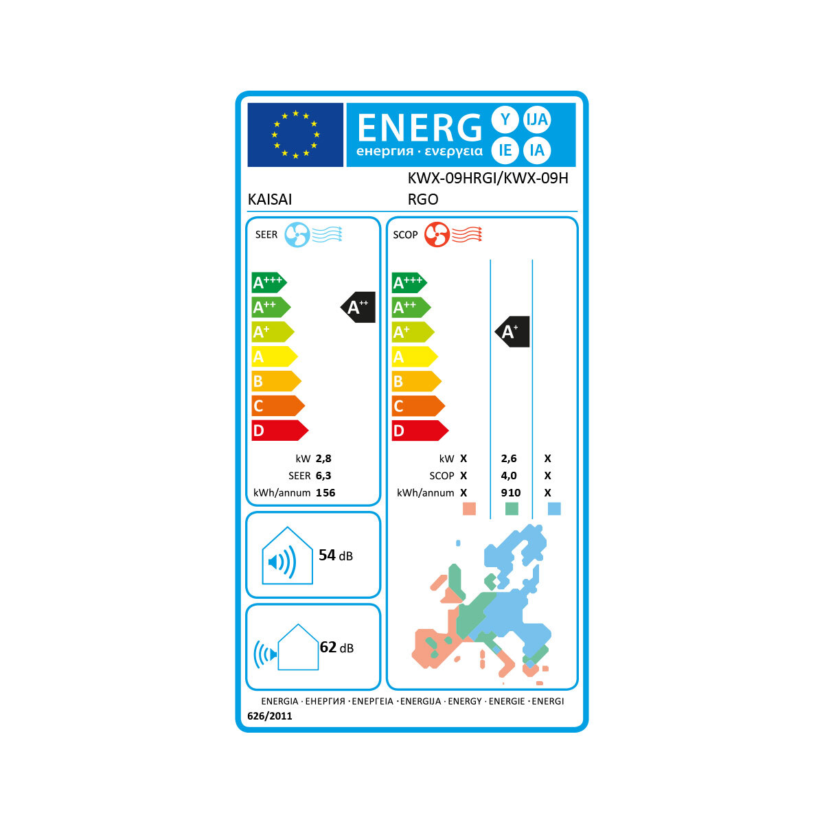 Marke: KAISAI Energieeffizienzklasse: A++/A+ Kühlleistung: 2,6 kW Heizleistung: 2,9 kW Schalldruckpegel Innen dB(A): 21 / 38 Schalldruckpegel Außen dB(A)‍: 55 Stromverbrauch Kühlen / Heizen kWh/Jahr: 156 / 910